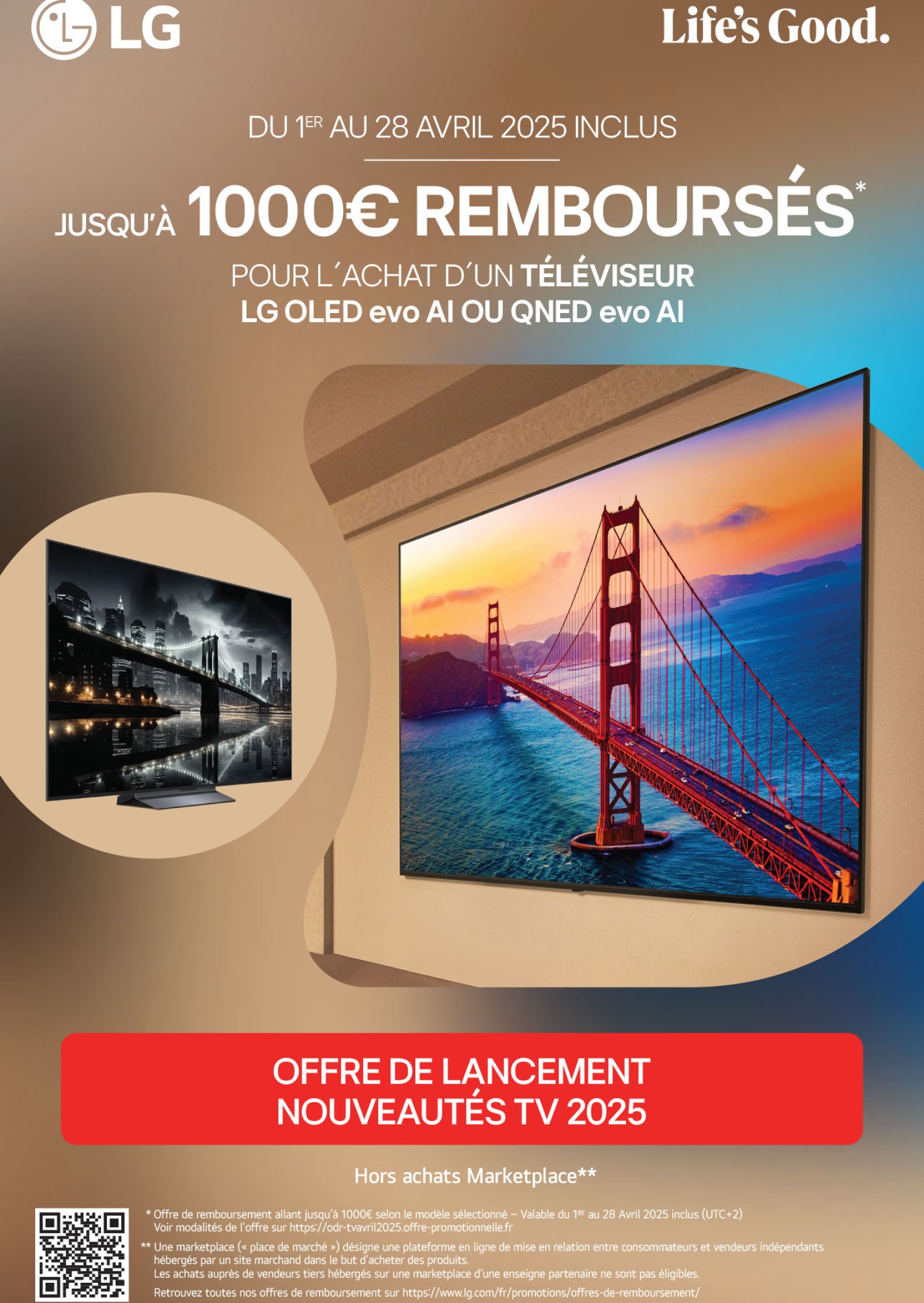 LG ofrece una oferta de reembolso por la compra de un televisor LG C5, LG G5 o LG QNED85A, LG QNED86A, LG QNED87A a partir de 2025, por un importe de hasta 1000 euros. ¡En camino hacia buenos negocios!