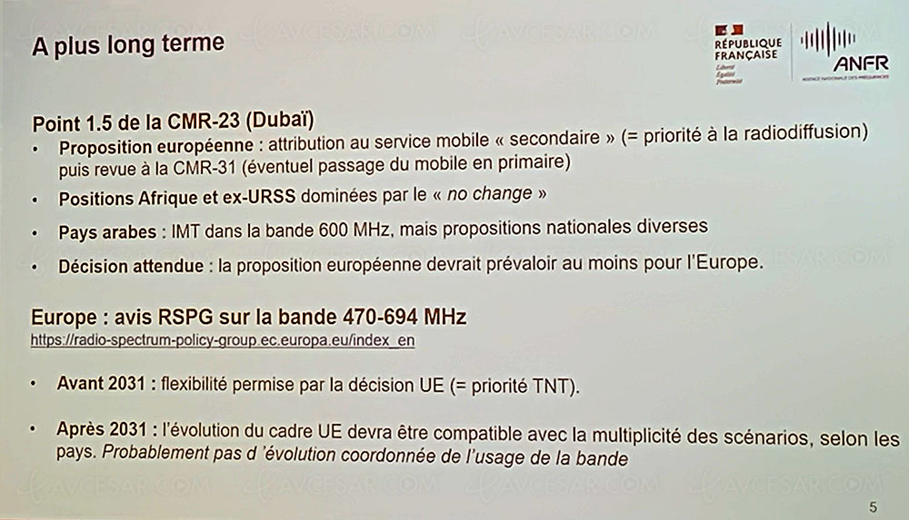 Para concluir, otra buena noticia anunciada por Gilles Brégant, director general de la ANFR (Agence Nationale des Fréquences), la seguridad de que la TDT continuará al menos hasta 2031, estando prevista una revisión (o no) de sus modalidades durante la CMR. -27 (Conferencia Mundial de Radiocomunicaciones) para el perÃodo posterior a 2031.