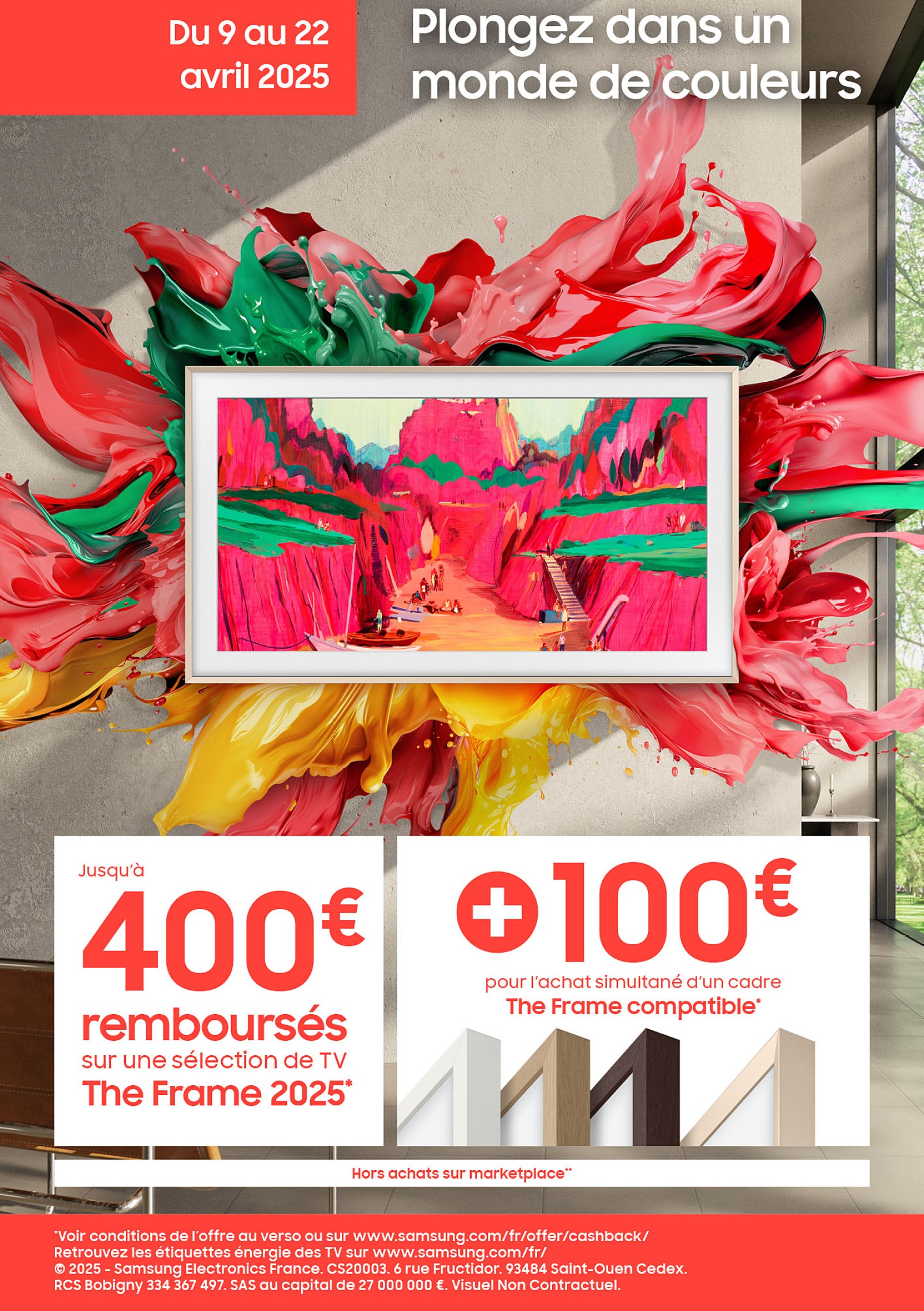 Y por la compra simultánea de un televisor Samsung The Frame o Samsung The Frame Pro y un accesorio The Frame de las referencias siguientes, te beneficiarás de un bono de reembolso adicional de 100 euros.