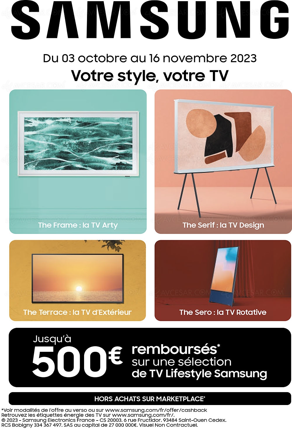 Oferta de reembolso Samsung The Serif, The Frame, The Sero, The Terrace TV, hasta 500 € reembolsados