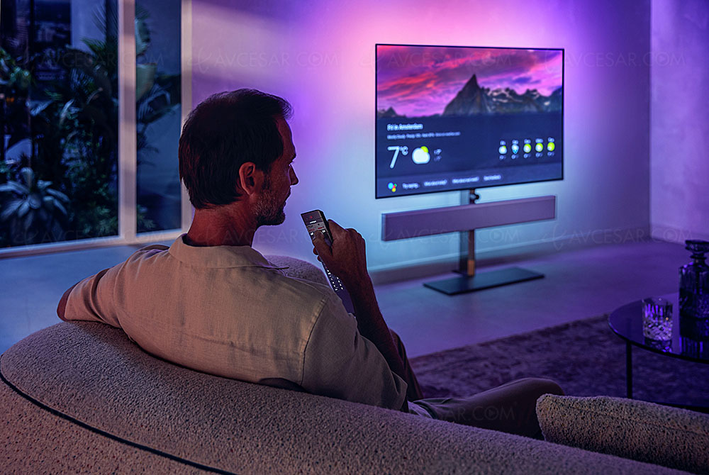 Nuevas características en comparación con el modelo 2019, e incluso en comparación con los televisores Philips OLED806 presentados a principios de año (ver nuestras novedades Oled Ultra HD 4K Philips OLED806: 48 '', 55 '', 65 '' y 77 acercándose ), son numerosos. En resumen, el televisor Philips 65OLED986 integra todos los desarrollos enumerados en la serie de televisores Philips OLED936. Primero, está el panel Oled de nueva generación que ofrece LG Display (el que está disponible en los televisores Oled LG G1 dijo Evo). Este último ofrece hasta un 20% más de salida de luz dependiendo de la imagen mostrada. También destacamos la compatibilidad HDR10 + Adaptive que, como recordatorio, utiliza los datos proporcionados por el sensor de luz del televisor para adaptar la imagen al entorno. Por lo tanto, sean cuales sean las condiciones ambientales, la imagen transmitida siempre será de una calidad óptima.