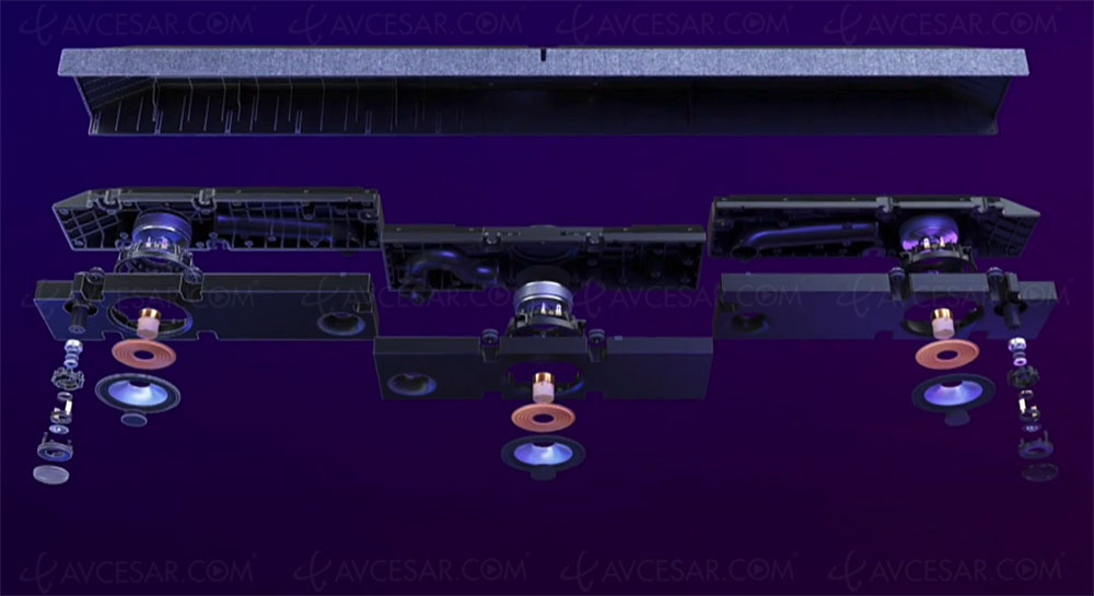 También notamos que la barra de sonido está formada por tres cajas aisladas (con un tweeter presente en las cajas derecha e izquierda) para una respuesta de frecuencia optimizada y para evitar resonancias. También hay nuevos componentes de filtrado de alta calidad, sin mencionar la posibilidad de conectar un subwoofer externo para mayor impacto en las bajas frecuencias. La potencia total entregada es de 70 W y también se requiere compatibilidad con Dolby Atmos. También es posible, a través de la configuración de Película, aplicar procesamiento virtual Dolby Atmos a una señal de audio clásica.