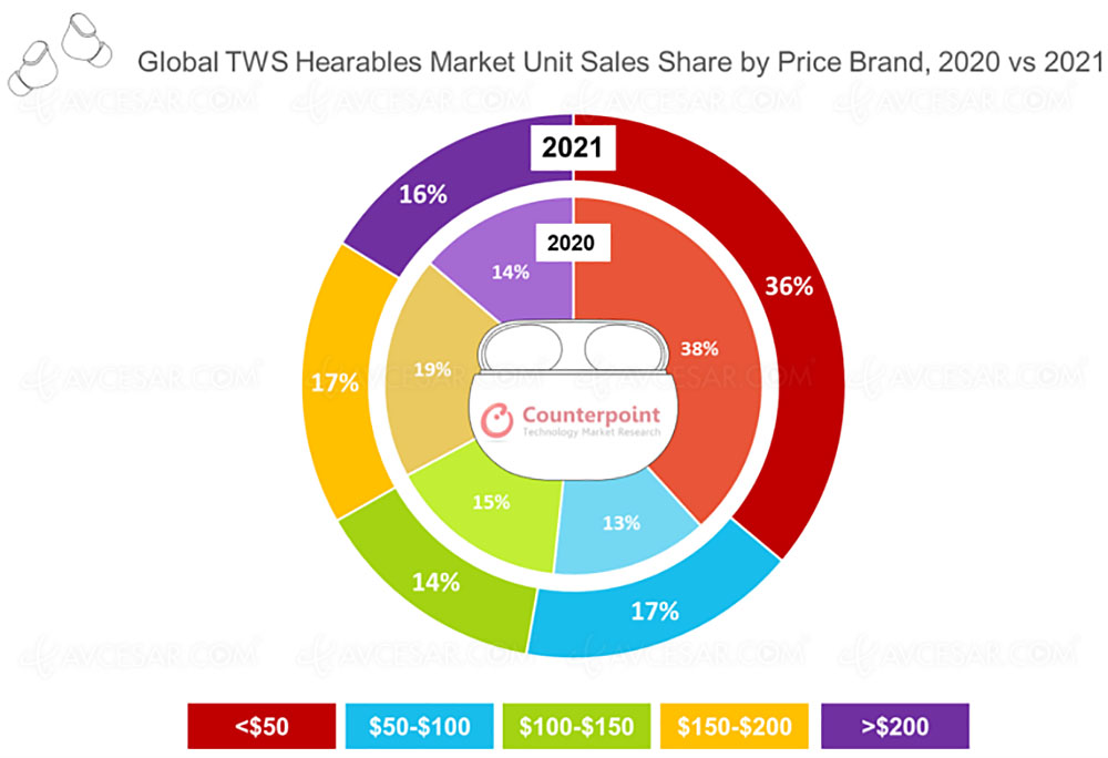 Tenga en cuenta que el crecimiento del sector se debe en particular a los productos exhibidos en un rango de precios de $50-$100, y los que superan los $200. Los primeros aumentan su cuota de mercado del 13% al 17% entre 2020 y 2021, mientras que los segundos pasan del 14% al 16%. El segmento de $50 a $100 está dominado notablemente por JBL y Xiaomi, mientras que Apple domina el segmento muy rentable por encima de $200 con una participación de mercado del 75 % (consulte el gráfico anterior).