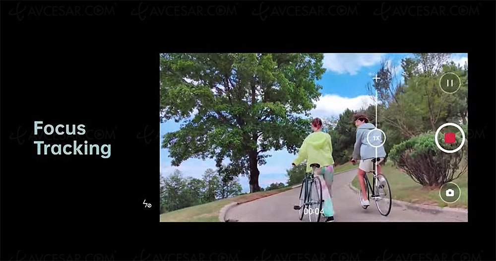 La función AI Video realiza automáticamente un ajuste optimizado del teléfono inteligente, de día o de noche, dependiendo de la luz ambiental. Con el objetivo de realizar videos claros, brillantes y con colores vivos. Por su parte, el parámetro Focus Tracking (ver foto a continuación) permite el seguimiento automático del enfoque del personaje principal para videos con una nitidez que nunca falta. También podemos citar el proceso de embellecimiento de video para retoques en tiempo real o la función Portait Couleu IA. El fondo se trata en blanco y negro y el sujeto principal permanece en color. De manera similar, el modo Dual View (ver foto arriba) ofrece una excelente ergonomía y la producción de secuencias más envolventes.