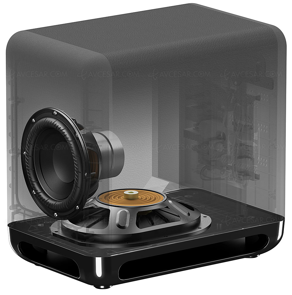 La referencia de Sony HT-A5000 es, por lo tanto, una barra de sonido 5.1.2 que se vende sola. Pero puede evolucionar enormemente con la adición de un par de altavoces envolventes inalámbricos compactos, el Sony SA-RS3S, y luego aprovechando la adición de un subwoofer externo inalámbrico Sony SA-SW3 opcional (membrana de 160 mm y potencia de 200 W, ver la segunda foto a continuación) o Sony SA-SW5 (membrana de 180 mm y 300 W de potencia, ver la primera foto a continuación). Por lo tanto, con un par adicional de envolventes, la decodificación virtual Dolby Atmos 5.1.2 se vuelve discreta para mejorar el rendimiento del canal envolvente.
