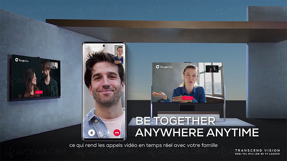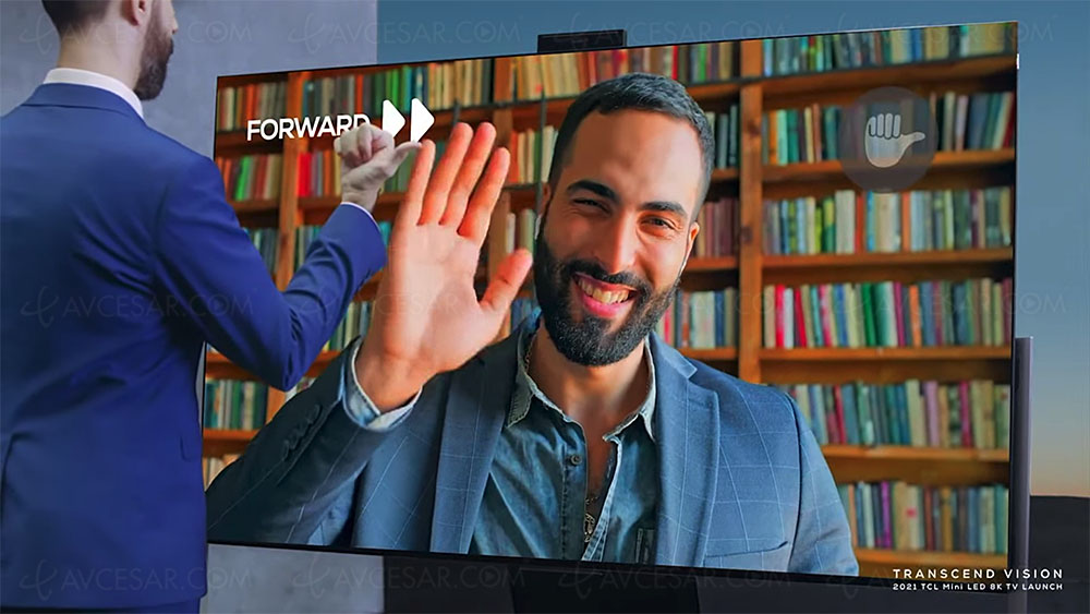 Control de gestos Además, las pantallas TCL 85X925 están equipadas con una cámara motorizada ToF 3D de 48 Mpxls, la primera de su tipo, para el control por gestos del televisor a través del módulo AI integrado. Por lo tanto, es posible activar el avance rápido de un programa de transmisión con un simple gesto de autostop (ver foto a continuación). Asimismo, este último puede analizar con precisión la postura de observación y la distancia de la persona para adaptar la configuración de la imagen en consecuencia. Por último, la aplicación integrada Google Duo (ver la segunda foto a continuación) permite conversaciones visuales con familiares, amigos o conocidos.