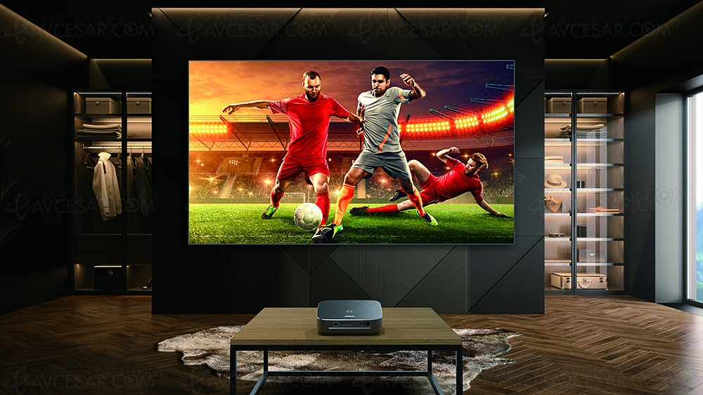 También observamos una distancia focal fija con una relación óptica de 1,21:1 para una imagen diagonal que se muestra desde 37'' (1 m hacia atrás) a 200'' (5,18 m hacia atrás aproximadamente), y un ruido de funcionamiento anunciado que oscila entre 27 dB y 31 dB, respectivamente en modo Eco y Normal, más un mini sistema de sonido con una potencia total de 2 x 3 vatios. También presente, enfoque automático automático y corrección trapezoidal (hasta +/- 30 grados).