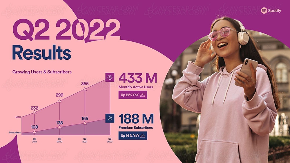 El número de suscriptores premium de Spotify alcanza los 188 millones en el segundo trimestre de 2022, un 14 % más que en el mismo período del año pasado. En cuanto a la cantidad de usuarios activos, aumentó un 19% durante el mismo período para llegar a 433 millones, el crecimiento más fuerte registrado por Spotify para un segundo trimestre. Por cierto, estas dos cifras son superiores a las estimaciones emitidas por la plataforma en el trimestre anterior.