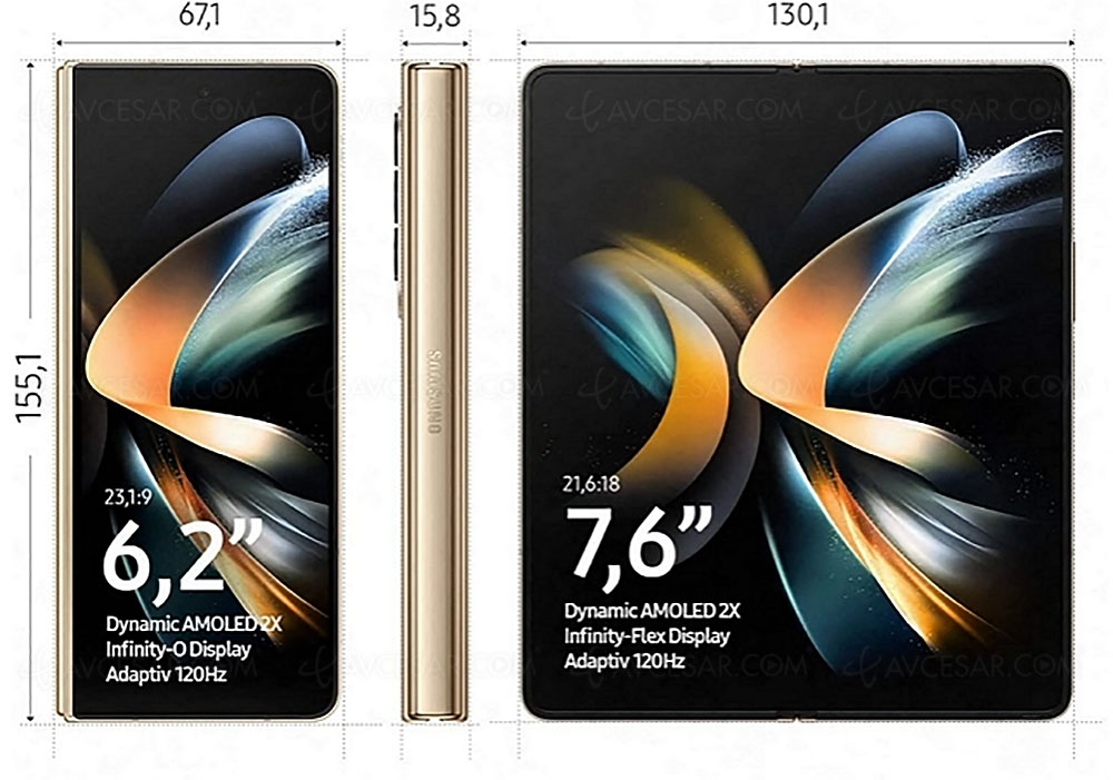 No olvidemos recordar el lado práctico del Galaxy Z Fold 4, tan grande como una tableta iPad Mini una vez desplegada pero que, plegada, ocupa poco espacio. En el lado de la pantalla, hay una muestra principal Oled de 7.6 '' (19.3 cm), HDR10 + con una resolución de 1.812 x 2.176 pÃxeles (373 ppi) y una frecuencia de actualización de 120 hercios. La pantalla exterior (6,2'' por 15,74 cm), también obediencia OLED con ratio 23,1/9 y equipada con un display de 120 Hz, muestra una resolución de 904 x 2.316 pÃxeles.