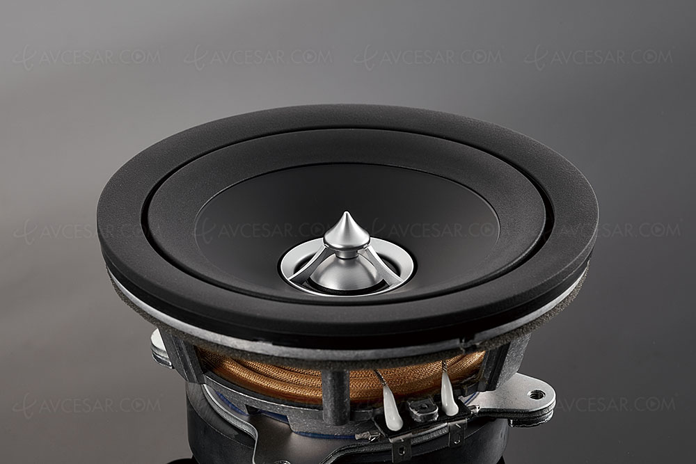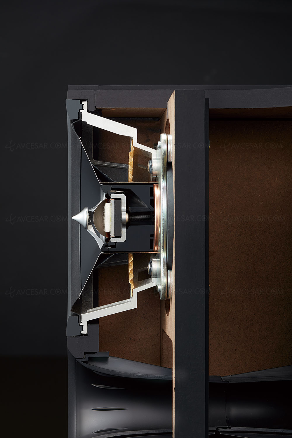 Por otro lado, encontramos la tecnología BDMA (arquitectura de montaje de altavoz balanceado). Este último, a través de un elemento interno vertical al chasis y conectado a su base, permite montar el coaxial HP (aluminio anodizado) alrededor del centro de gravedad de su imán.