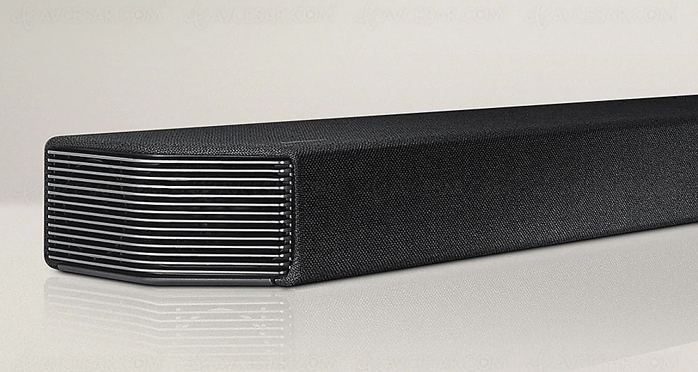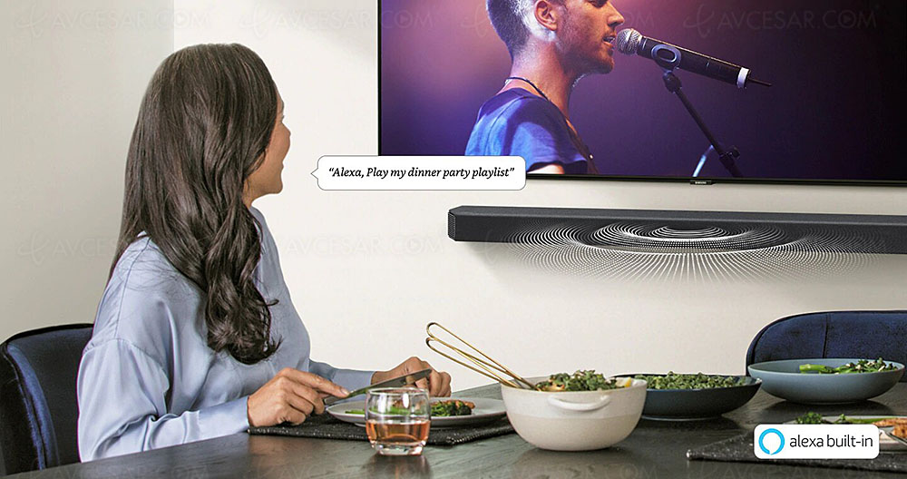 Para saber de nuevo, Samsung ha reducido la altura del HW-Q950A a 69,5 mm, no más, para facilitar su integración bajo los televisores de la marca por supuesto, pero también bajo la mayoría de televisores del mercado. Finalmente, el Samsung HW-Q950A, compatible con la aplicación doméstica SmartThings, se puede integrar fácilmente en su propia instalación doméstica conectada. Asimismo, la integración del asistente de voz Alexa permite el control por voz.