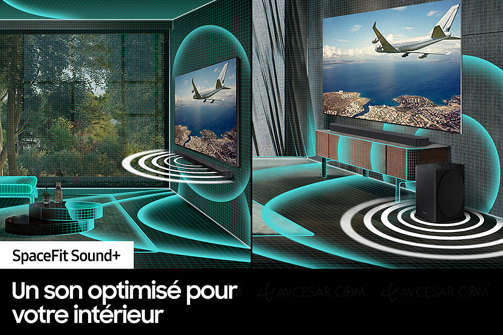 Por lo demás, encontramos por tanto el sistema Q-Symphony firmado por Samsung, que permite en presencia de un televisor QLED 2020/2021 de la marca dejar sus altavoces activos cuando la barra de sonido también está activa (estos últimos estaban hasta ahora desactivado) para disfrutar de un entorno de sonido más rico, ampliado por los altavoces del televisor.