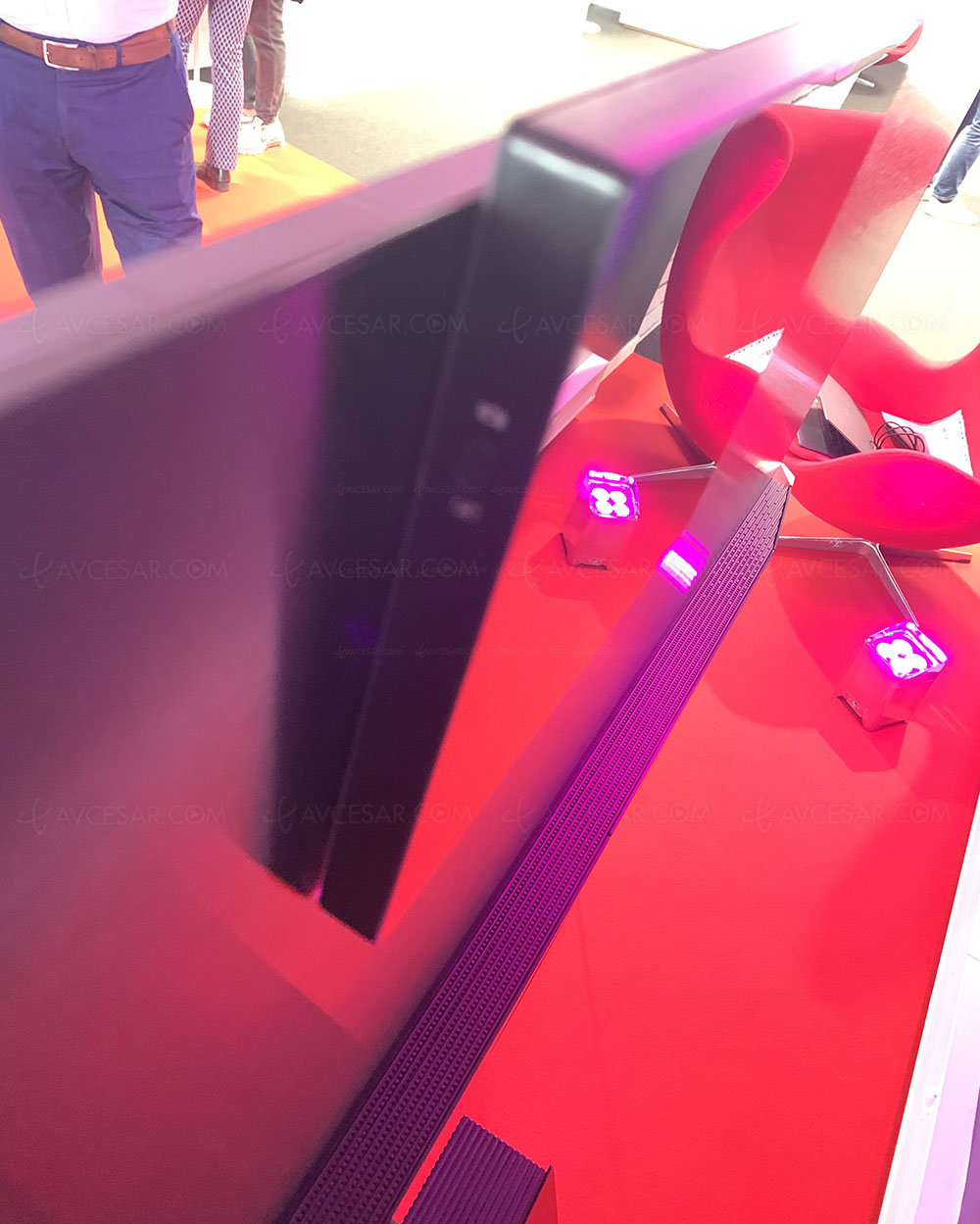 5.1.2 y 160 W de sonido !!! ! La sección de audio consta de un sistema 5.1.2 en forma de barra de sonido Onkyo acompañado de un subwoofer alojado en el soporte del televisor (ver foto a continuación). Compatible con Dolby Atmos, está equipado con 25 altavoces (incluido un subwoofer con una capacidad de 7 litros) para una potencia total de 160 W (7 x 10 W + 9 W).