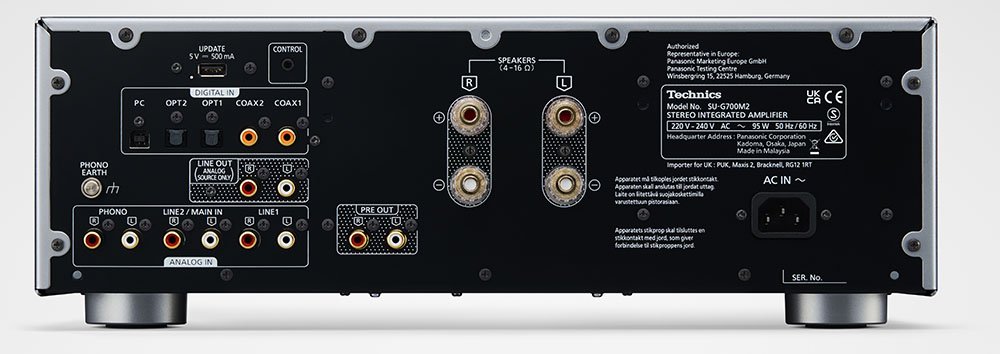 • Entradas: 2 coaxiales, 2 ópticas, 2 entradas de lÃnea analógicas, 1 entrada Phono (MM y, nuevo en SU-G700M2, MC), 1 puerto USB Host tipo A y 1 puerto USB asÃncrono tipo B