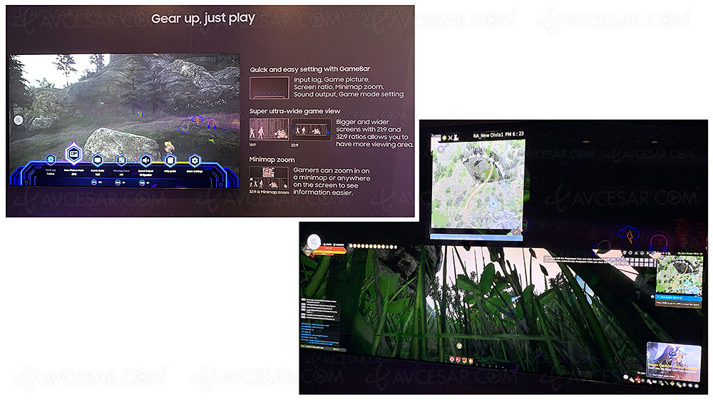 Para el usuario final, la ergonomÃa no es la única ventaja de la solución Gaming Hub. También le da una nueva dimensión a la noción misma de videojuego al ofrecerle, en la mayorÃa de los casos, la gran diagonal de la televisión asociada con una calidad de imagen incomparable. Especificidades que garantizan una verdadera sensación de inmersión dentro de universos virtuales creados desde cero con un realismo increÃble. Por supuesto, este gran tamaño de imagen está asociado con todas las tecnologÃas de "juego" desarrolladas en los últimos cinco años por Samsung. Podemos mencionar el procesamiento de 12 bits de la imagen de video que permite visualizar más detalles en las zonas oscuras de una imagen y ver enemigos ocultos (muy útil con ciertos tÃtulos de juegos en lÃnea), conectores HDMI 2.1 (todos d obediencia 2.1 del 55Q70B modelo) capaz de transmitir señales 4K/144 o 8/60 de las videoconsolas de última generación o de las nuevas tarjetas gráficas nVidia RTX 4000, o activando el ratio 32:9 (Super Ultrawide Gameview) aprovecha la visualización del mapa del juego a través de la opción Minimap Zoom (ver foto abajo) para progresar más fácilmente o preparar más fácilmente una estrategia de juego.Del mismo modo, el tiempo de respuesta ultrarrápido de esta nueva generación de televisores (también conocido como Input Lag) garantiza una baja latencia. Un punto particularmente sensible para los jugadores en lÃnea con la capacidad de respuesta de los distintos participantes puesta a prueba durante feroces batallas.