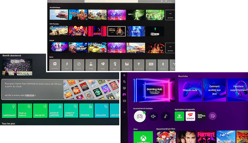 Sin embargo, los videojuegos no son solo “hardware†y hacer que este cambio sea atractivo implica necesariamente establecer alianzas con los nombres más importantes de los videojuegos. Por lo tanto, Samsung se ha acercado a jugadores de prestigio en el mundo de los videojuegos para ofrecer una oferta de juegos en la nube particularmente ambiciosa y totalmente desmaterializada. Por ejemplo, al emular la famosa consola de juegos XBox de Microsoft, los televisores equipados con Gaming Hub pueden usar directamente la oferta de Game Pass (ver foto a continuación), entre otras. Pero también se ofrecen otros muchos servicios, siempre simulando el comportamiento de diferentes videoconsolas, cajas multimedia o ordenadores PC. Por lo tanto, es posible acceder en particular a los servicios de Cloud Gaming Geforce Now (ver foto a continuación) firmado nVidia, asà como a los de transmisión de video ofrecidos por Twitch. Y más están por venir…