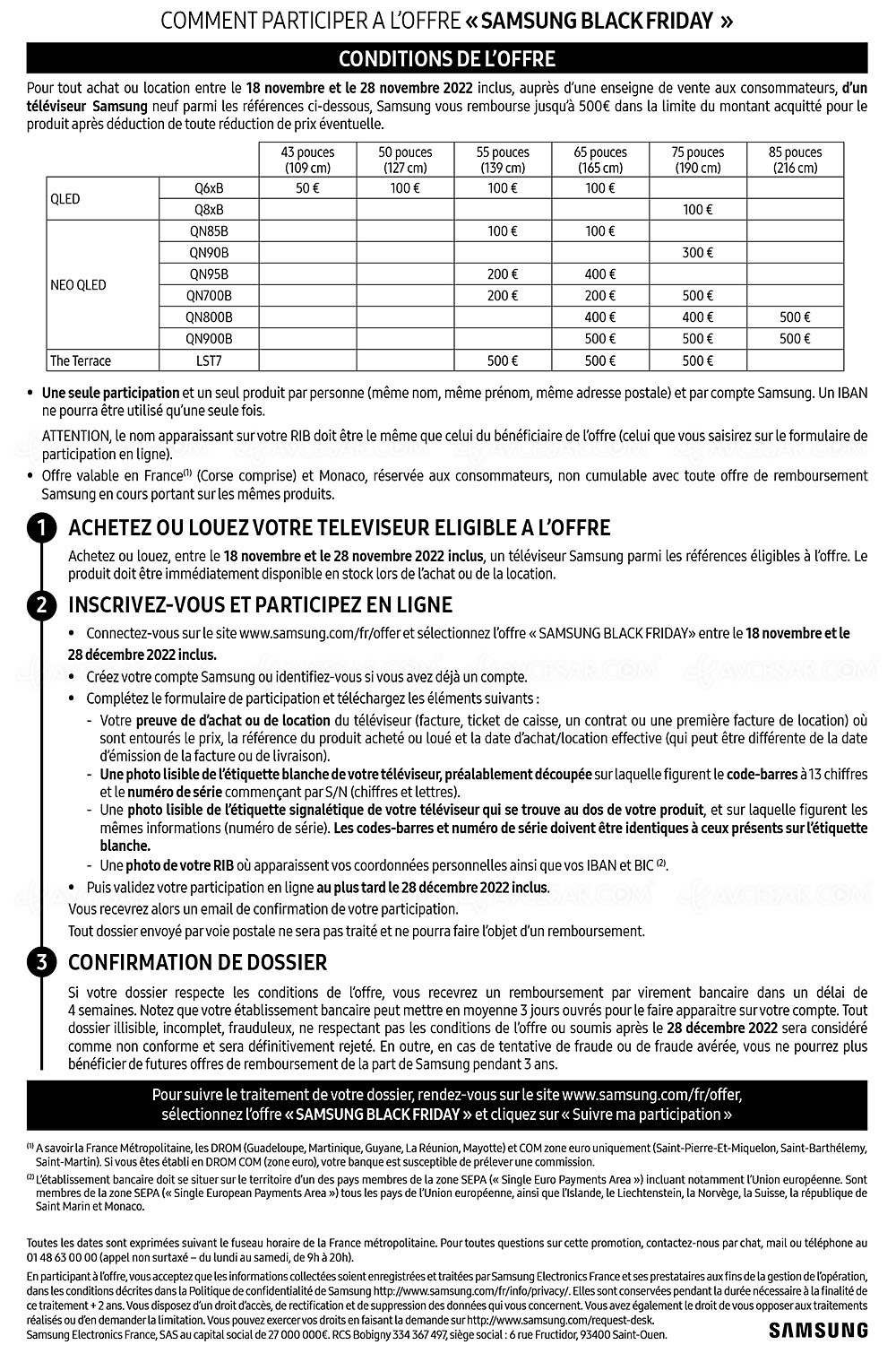 Hasta el 28 de noviembre, por cualquier compra de un televisor referenciado a continuación (haga clic en su referencia para obtener más información sobre el producto), la marca le reembolsa: • 50 € por un Samsung QE43Q6xB • 100 € por un Samsung QE50Q6xB, Samsung QE55Q6xB, Samsung QE55QN85B, Samsung QE65Q6xB, Samsung QE65QN85B o Samsung QE75QN8xB • 200 € para un Samsung QE55QN95B, Samsung QE55QN700B o Samsung QE65QN700B • 50 € para un Samsung QE75Q96B para un Samsung9 QE, Samsung9 QE65QN800B o Samsung QE75QN800B • 500 € por un Samsung 55LST7 The Terrace, Samsung QE65QN900B, Samsung 65LST7 The Terrace, Samsung QE75QN700B, Samsung QE75QN900B, Samsung 75LST7 The Terrace, Samsung QE85QN800B{9}N}