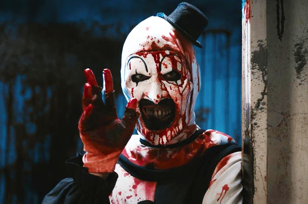 En Terrifier 2 (en la foto a continuación), después de ser resucitado por una entidad siniestra, Art the Clown regresa al condado de Miles, donde se dirige a una adolescente y a su hermano menor en la noche de Halloween.