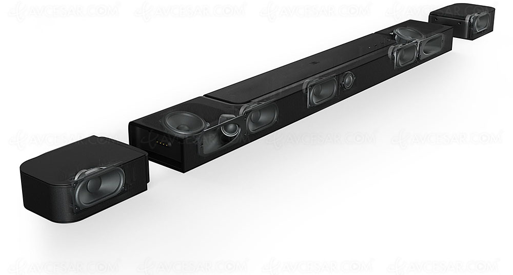 • Altavoces: 10 para la barra de sonido (2 dos de banda ancha de 70 mm en configuración Up-Firing para los canales Dolby Atmos Height + 3 racetrack HP de forma ovoide de 46 x 90 mm + 3 tweeters de 20 mm; los desmontables los altavoces tienen cada uno 1 altavoz ovoide tipo pista de carreras de 46 x 90 mm), 1 para el subwoofer (boomer de 26 centÃmetros).