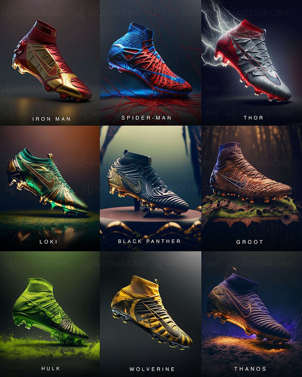 Como recordatorio, este programa de inteligencia artificial genera imágenes a partir de descripciones textuales, imágenes que luego pueden ser retocadas según lo desee su iniciador. Suficiente para dejar sin trabajo a muchos artistas, pero también para manifestar rápidamente las ideas más locas. Aquí se trata de una pintoresca colaboración ficticia entre Nike y Marvel iniciada por Paul Parsons, una colección de nueve pares de botas de fútbol con los colores de los héroes y villanos del universo cinematográfico y televisivo más rentable de todos los tiempos.