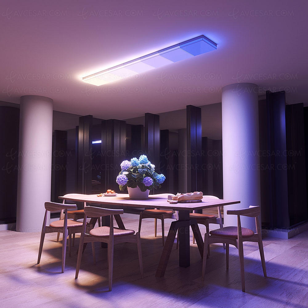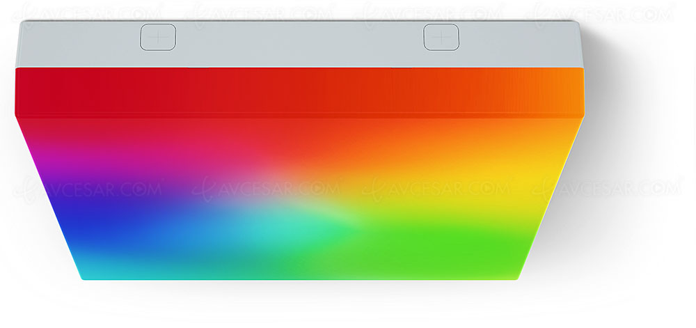 Compatible con Wi-Fi, Skylight ofrece luz blanca funcional para uso "normal" (ver foto arriba) y más de 16 millones de colores dinámicos para una atmósfera personalizada. Tenga en cuenta las funciones conectadas para ajustar el brillo, los colores, las temperaturas de color y establecer horarios. Skylight también tiene las funciones habituales de Nanoleaf: visualizador de música, espejo de pantalla, escenas de iluminación dinámica y escenas agrupadas.