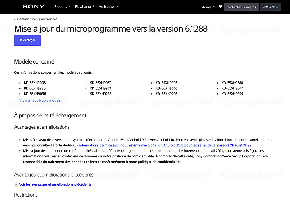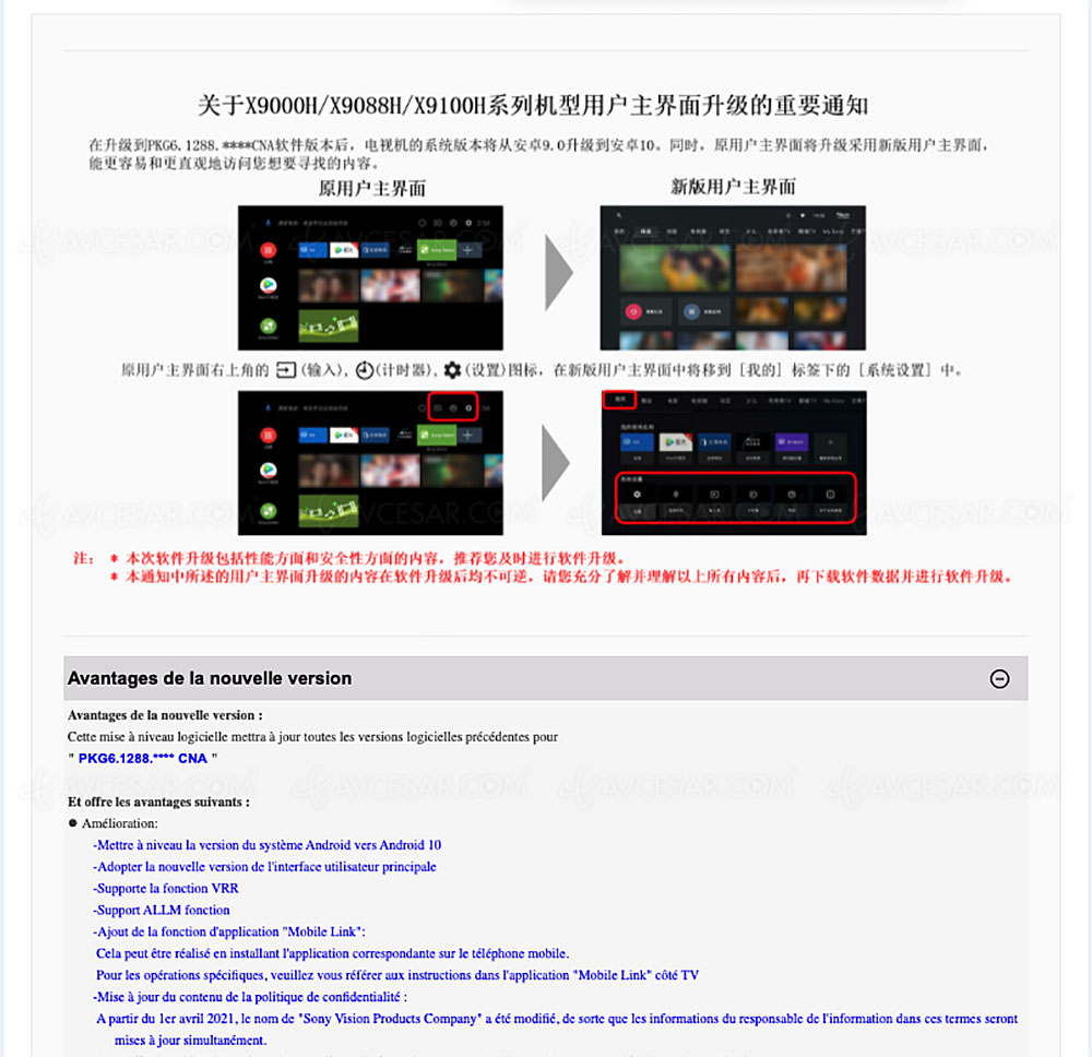 Descubierta en el sitio de Sony China a principios de este mes por el usuario del sitio de la comunidad de Reddit Nathaniel_Wu, la Actualización de firmware de Sony (v6.1288) para los televisores XH90xx antiguos de 2020 ahora es oficial (haga clic en la foto a continuación para ampliar y descubrir la lista de modelos en cuestión) y disponible en los distintos sitios web de la marca (ver foto a continuación en el sitio de Sony Francia).