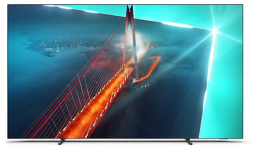 , Philips OLED708 TV, P5 6.ª generación Por lo demás, hay un panel Oled "clásico" (y no Oled EX) que muestra un pico de luz de 720 nits (10% ventana blanca), un sistema Ambilight de tres lados (izquierdo, derecho y superior) y un doble pierna en lugar de una pierna central. Del mismo modo, mientras que el chip P5 Gen7 alimenta las series Philips OLED808 y Philips OLED908, sigue siendo la sexta generación del procesador P5 (vea nuestras noticias sobre el procesador Philips P5 Engine Gen6: HDR10+ Adaptive, Calman Ready, Ambient Intelligence, Imax Enhanced…) que es en orden. Por supuesto, el sensor de luz ambiental y el sistema anti-marcas (para contrarrestar el fenómeno Burn-In) están presentes.