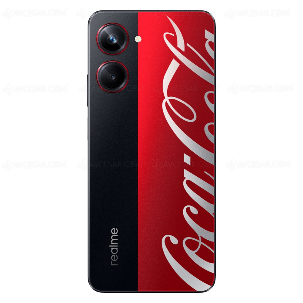 Además de una parte trasera estampada con un diseño con la imagen de la marca, el smartphone luce un sensor de huellas dactilares lateral grabado con el logo de Coca Cola. Más fuerte, la textura del móvil recuerda el tacto de aluminio de una lata, según Realme. Tenga en cuenta también un sonido de lata que se abre en lugar del clic habitual de la cámara y muchos otros dispositivos como iconos, fondos de pantalla y tonos de llamada sobre el tema de la bebida. Precio orientativo, unos 240 euros.
