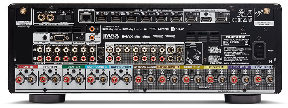 La conexión dispone por tanto de seis entradas HDMI 2.1 CEC certificadas, más tres salidas transparentes a señales Deep Color, xvYCC, 1080p/24 y 3D, Ultra HD 4K u 8K. También hay cinco estéreos RCA, un Phono, dos coaxiales, dos ópticos, una salida Pre-Out 2.0 (zona 2), la salida Pre-Out 11.4 ya mencionada y cuatro salidas de subwoofer. Más once pares de terminales de tornillo y un puerto host USB (frontal) y otro Ethernet.