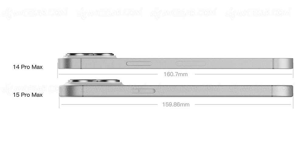 AsÃ, en la mano, el iPhone 15 Pro Max será un 5% más grueso, pero el módulo de la cámara destacará mucho menos, reduciendo el grosor efectivo. Tenga en cuenta que en los diagramas técnicos desenterrados por IceUniverse, podemos ver los nuevos bordes ligeramente redondeados y la ausencia de botones, ya mencionados en rumores anteriores.