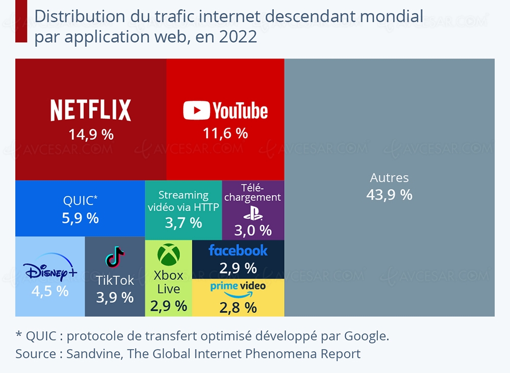 El último informe de la empresa americana Sandvine, especialista en equipos de red, demuestra la importancia del vÃdeo en el uso de Internet, pero también y sobre todo el fenómeno Netflix, que sigue batiendo todos los récords, al representar aproximadamente el 15% de la audiencia mundial. recursos web en 2022.