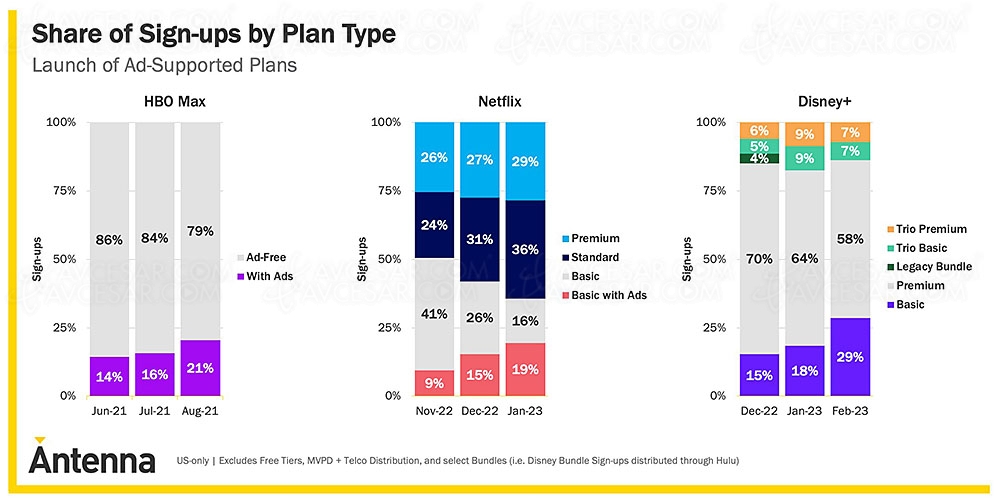 Según la firma analista Antenna, Disney+ ha tenido un mejor comienzo que sus competidores en el área de opciones de suscripción más económicas y con publicidad. AsÃ, en el primer mes de lanzamiento, esta opción en Disney+ representa el 20 % de las nuevas suscripciones, mientras que esta cifra es del 9 % para Netflix y del 14 % para HBO Max.