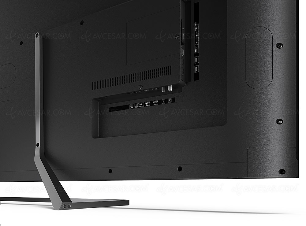 En primer lugar, porque inmediatamente visible, el diseño, por supuesto, con un pie central perforado y un marco de panel LCD extremadamente delgado. También destacamos la tecnología de nanocristales Quantum Dots para una cobertura muy amplia de la gama DCI-P3 (92%), la función Android 11 Smart TV (en comparación con Android TV 9.0) y una barra de sonido estéreo integrada (tweeter y woofer de rango medio equipado con una cámara acústica de 0,5 l para cada altavoz en cada canal), y firmada Harman Kardon, entregando una potencia de 2 x 15 vatios. También podemos citar una compensación de movimiento Active Motion 1000, un sistema de retroiluminación Direct LED Global Dimming (pico de luz de 400 nits) y una conexión con cuatro entradas HDMI 2.1 con funciones eARC, VRR (48 Hz a 60 Hz) y ALLM. Más un modo de juego y un retraso de entrada de alrededor de 10 milisegundos.