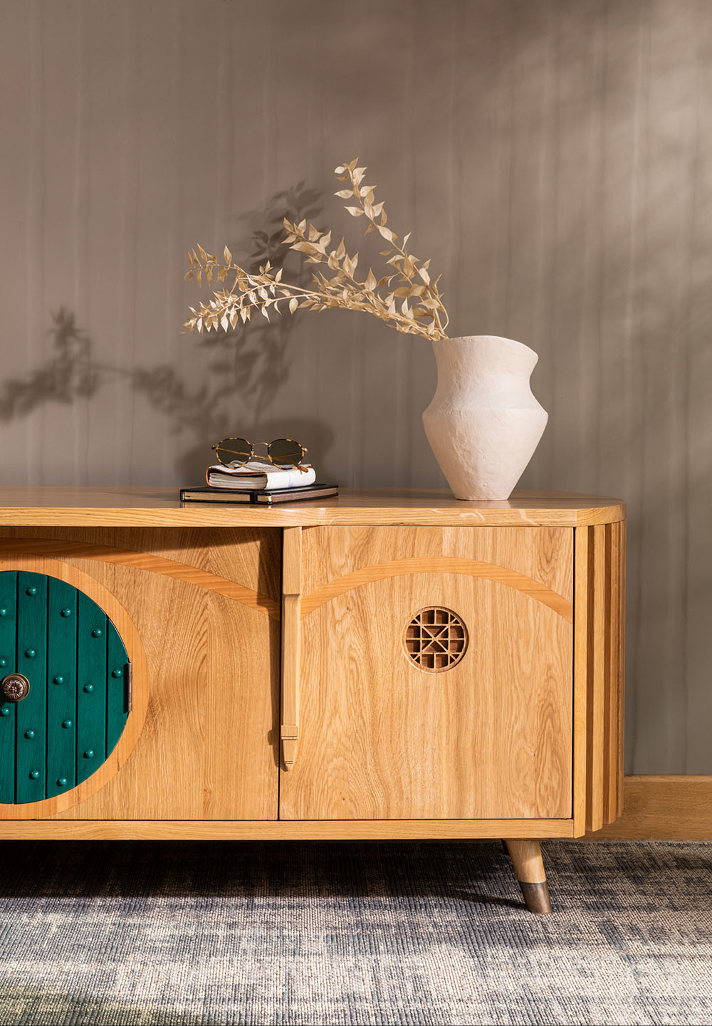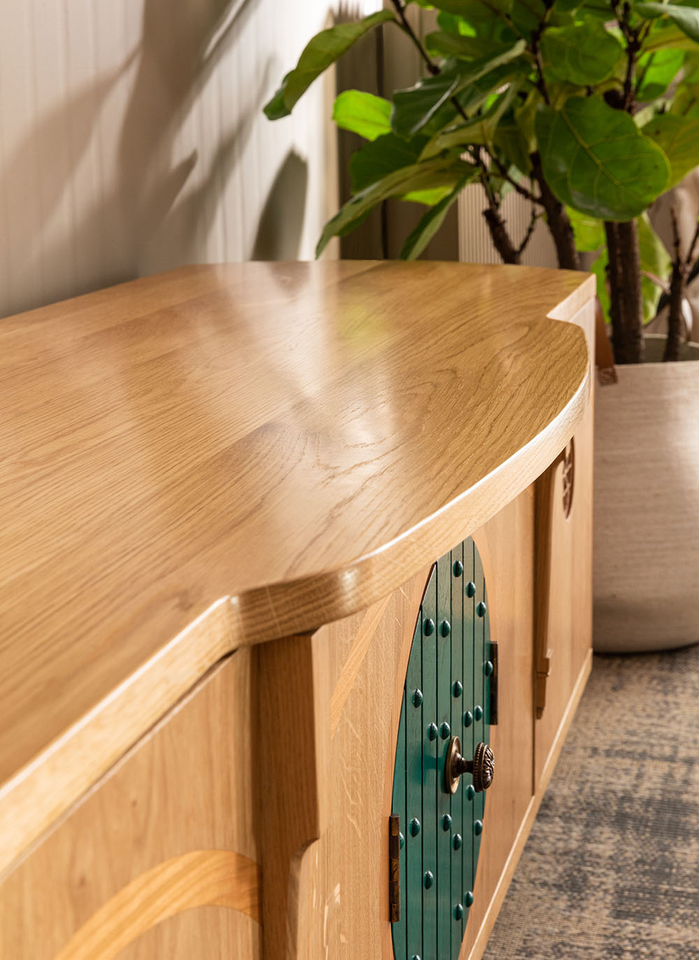 Otro hermoso objeto producido por Fanstatic Home, el soporte Bilbo TV se refiere directamente al hábitat redondo y alegre de los Hobbits. Con su puerta central en un hermoso verde azulado, sus detalles cincelados, sus numerosos espacios de almacenamiento (incluido un escondite secreto), sus ingeniosos conductos de cables y su espÃritu escandinavo rubio y acogedor, debe encajar perfectamente en hermosos y cálidos interiores. Fabricado en roble francés macizo y cerezo, también se produce en 100 ejemplares a un precio orientativo de 6.490 €