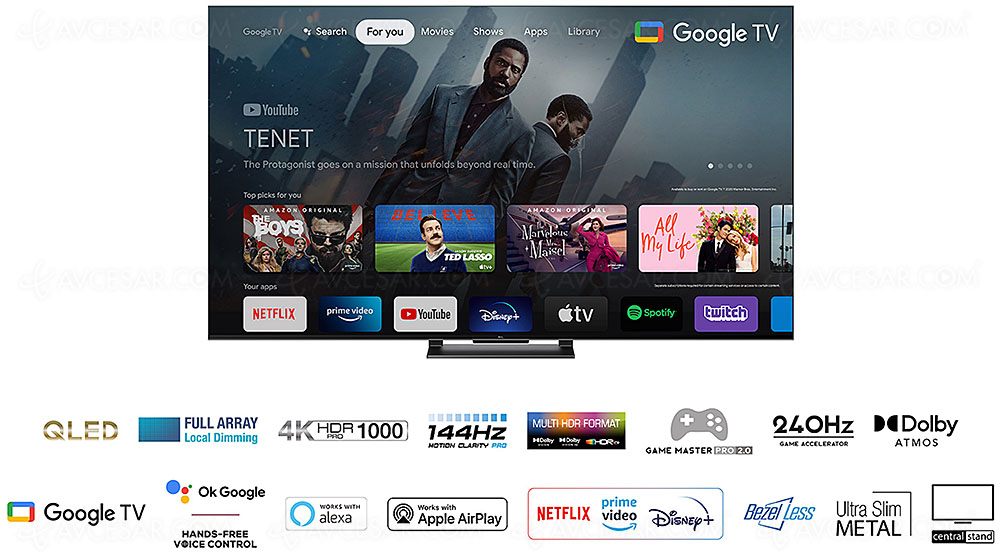 TCL C745, Smart Google TV Por supuesto, al igual que sus antecesores, los televisores TCL C745 incluyen la función Smart Google TV (Android 11). Para la conectividad, se requiere la función Wi-Fi 5 además de Bluetooth 5.0. TodavÃa notamos las certificaciones AirPlay 2 / HomeKit y Works with Alexa (requiere un altavoz tipo Amazon Echo). Además de tener un navegador de Internet, funciones de búsqueda por voz y Chromecast, que ofrece acceso a Google Play Store rica en varios miles de aplicaciones gratuitas, está la gestión de múltiples cuentas, el PIP, la función Cast eficiente en contenido Ultra HD, gestión multitarea para navegar entre varias aplicaciones, acceso rápido a los contenidos favoritos a través de una barra de información lateral superpuesta, compatibilidad con Google Assistant, la aplicación Google Meet y la función Hands free Voice Control (control por voz del televisor) sin necesidad de mando a distancia (miro integrado en el televisor).