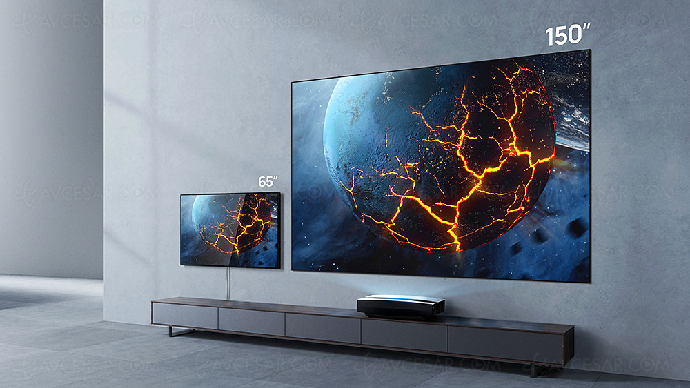 En el capítulo de Smart TV, el XGimi Aura incluye la función Android 10 (con Chromecast integrado) que ofrece acceso directo al universo de Google, con por supuesto las aplicaciones de los principales servicios de streaming: Netflix, Amazon Prime Video, Rakuten y YouTube… Última precisión, para mostrar una imagen de 100 ”, es decir, 254 cm, por lo tanto, mucho más grande que la de un televisor de 65” (165 cm), por ejemplo (véase la segunda imagen a continuación), la retrospectiva necesaria es de solo 20 centímetros. Ésta es la principal ventaja de un proyector de distancia ultracorta.