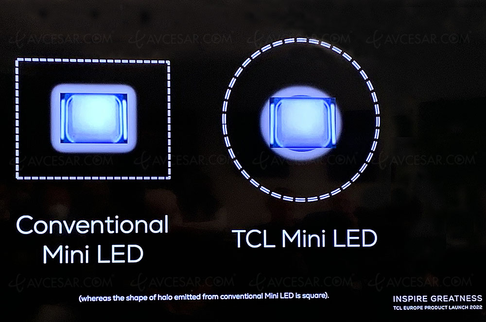 TCL C805, ¡las especificaciones principales! !!! En los modelos Ultra HD 4K LCD VA 144 Hz, los televisores TCL C805 están equipados con un panel nativo de 10 bits. Buenas noticias, las encontramos en el sistema de retroiluminación Mini LED del TCL C805, pantallas OD20 de quinta generación (distancia entre el sistema de retroiluminación y el panel LCD de 20 mm) y, en general, todas las recetas del TCL C845 (cf. nuestro Novedades TV TCL C845 4K Ultra HD: Mini LED OD10, QLED, 2.000 nits, HDR10+, Dolby Vision/Atmos, 144 Hz y Google TV). En primer lugar, diodos estrictamente idénticos, sobre todo en términos de eficiencia (eficiencia eléctrica, longitud de onda, potencia) para garantizar una perfecta homogeneidad de la imagen, pero también en términos colorimétricos para una total uniformidad y para combatir directamente el efecto Demura (también llamado Clouding). desde el sistema de retroiluminación y ya no sólo en el panel LCD. Asimismo, estos LED integrados pueden cambiar de estado extremadamente rápido, menos del tiempo necesario para mostrar una imagen, incluso con una señal de 120 hercios. Esta función, denominada Direct Drive por TCL, elimina los problemas de sombras en los objetos en movimiento.