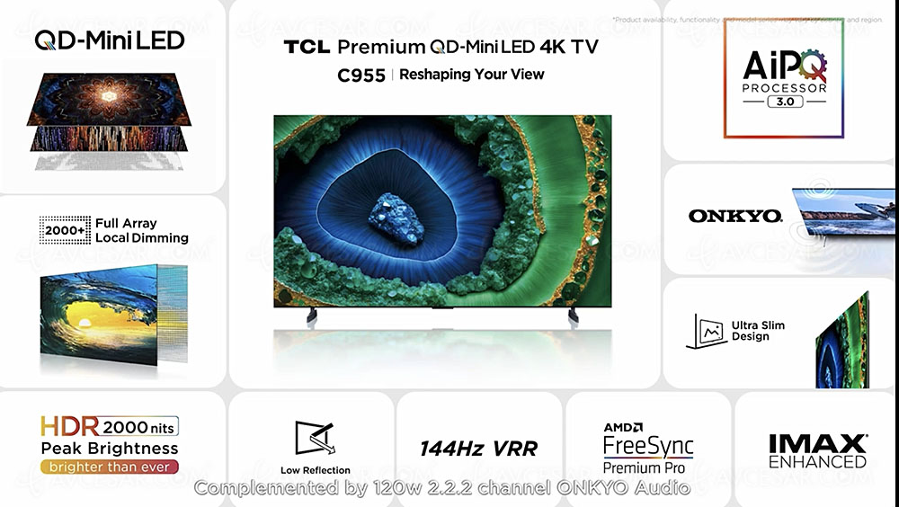 TCL C955, especificaciones principales En cuanto a caracterÃsticas técnicas, los televisores TCL C955 muestran un pico de luz de 2.500 nits y la tecnologÃa QLED (Quantum Dots) permite una cobertura del 97% de la gama DCI-P3. Por supuesto, encontramos el nuevo procesamiento de vÃdeo AiPQ 3.0 con un Ãndice de fluidez PPI 5000. Finalmente, las pantallas TCL C955 se benefician de un nuevo revestimiento antirreflectante y un único mando a distancia, fabricado en metal y equipado con teclas del 0 al 9, acompaña a ellos.