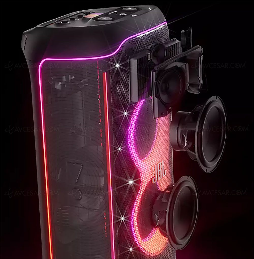 El JBL PartyBox Ultimate tiene dos tweeters de 74 mm, dos controladores de medios de 120 mm y dos woofers de 24,2 centÃmetros. La amplificación ofrece una potencia total de 1100 vatios.