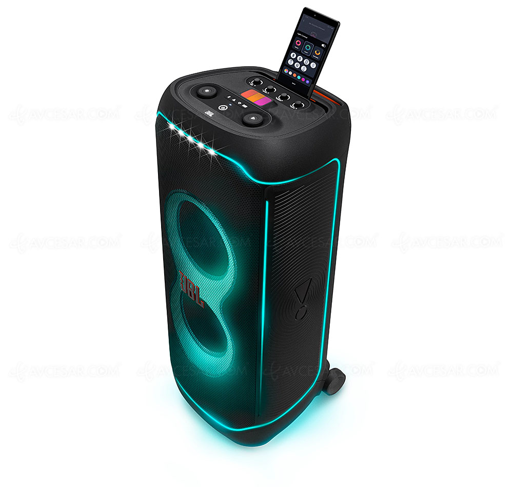 Compatible con Dolby Atmos (solo vÃa Wi-Fi) para disfrutar de pistas musicales de Spatial Audio, agrega luz al sonido con su iluminación frontal ajustable. El JBL PartyPad ubicado en el panel superior (ver foto a continuación) te permite improvisar como DJ con efectos de sonido accesibles a través de varios controles: tocar, mantener presionado y arrastrar. Finalmente, tenga en cuenta las entradas de guitarra, el micrófono dual y la configuración del ecualizador de karaoke, asà como la resistencia a salpicaduras (IPX4).