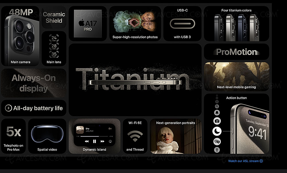 Mención especial también para la desaparición del puerto propietario Lightning, en favor del estándar USB-C impuesto por la legislación europea. Compatible con USB 3, permite velocidades de transferencia de archivos anunciadas por el fabricante como 20 veces superiores a las del modelo anterior. Otra novedad, el interruptor de timbre/silencio es ahora un nuevo botón de Acción capaz de evolucionar para acceder a diversas funciones personalizables como la cámara, la linterna, el modo silencio, etc.