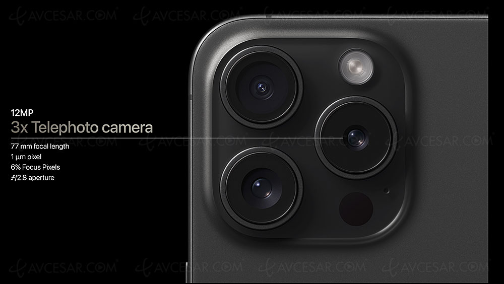 Los dispositivos funcionan con el nuevo procesador Hexa Core A17 Bionic grabado en 3 nanómetros. Este chip está soportado por un procesador gráfico Apple de seis núcleos. Hay tres sensores de foto/vÃdeo: Lente principal de 48 Mpxls (apertura Æ’/1, 78) + Ultra gran angular de 12 Mpxls (apertura Æ’/2.2) + Teleobjetivo de 12 Mpxls (apertura Æ’/2.8). Este nuevo teleobjetivo de 120 mm ofrece un zoom óptico de hasta 5x, pero solo para el iPhone 15 Pro Max (3x para el Pro).