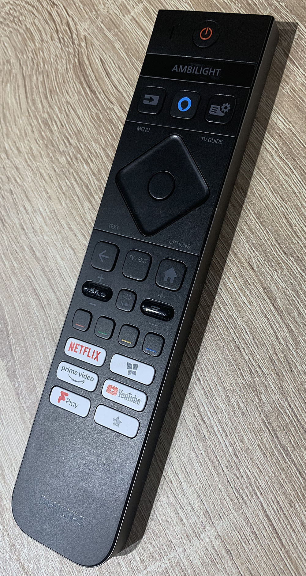 El mando a distancia de los televisores Philips OLED908 será recargable en 2023 (a través de USB-C). También ofrece un nuevo atajo de teclado, "123", para encender o apagar la luz de fondo. Este último también se puede asociar al sensor de movimiento integrado para activarse automáticamente en cuanto se coge.