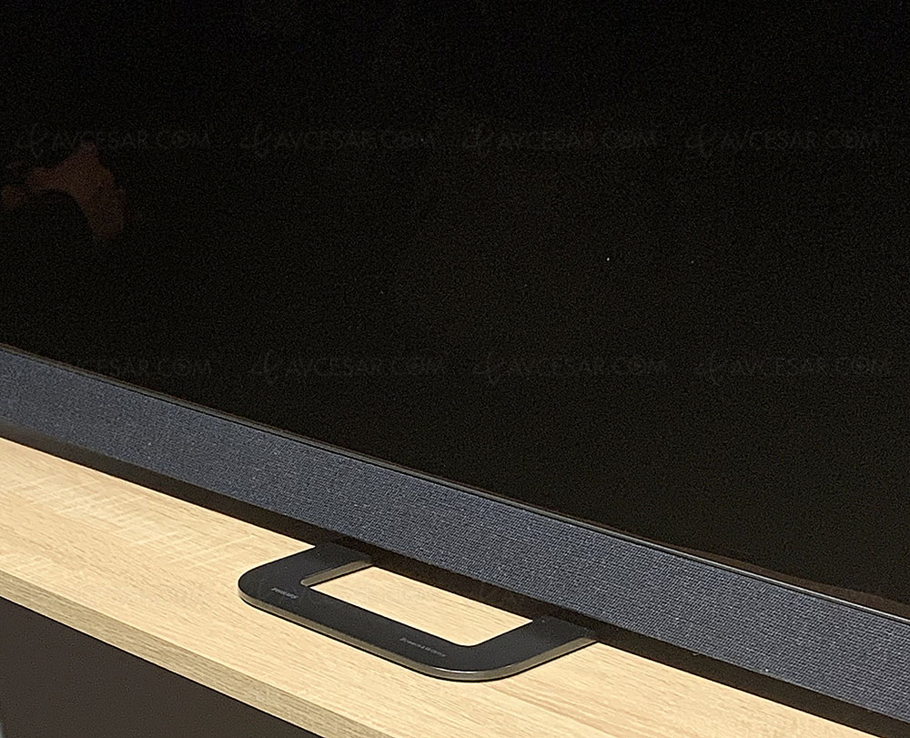 En el televisor OLED908 encontramos la barra de sonido 3.1 de 80 W de potencia firmada por Bowers & Wilkins con un diseño minimalista, ya presente en las referencias OLED907 y aún perfectamente integrada bajo el panel de la pantalla. Equipado con seis altavoces en configuración LCR (izquierda, centro, derecha), ofrece un amplio escenario sonoro y un diálogo perfectamente inteligible. Se apoya en un gran subwoofer ubicado en la parte trasera del televisor acompañado de cuatro membranas pasivas.