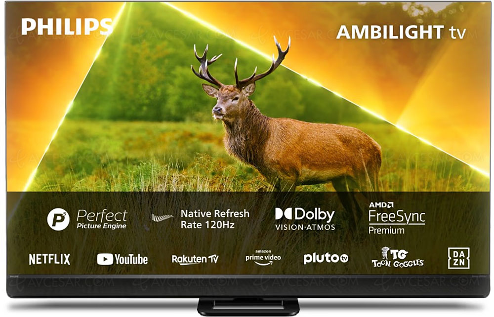 Respecto a estos televisores Mini LED equipados con paneles LCD de 10 bits y 120 Hz, Philips anuncia un pico de luz de 1.000 nits, una cobertura del 98% de la gama DCI-P3 y un sistema de retroiluminación Full LED Local Dimming. Es decir, el ejemplar de 55'' tiene 80 zonas independientes, 144 para el de 65 pulgadas. Por supuesto, el brillante proceso Ambilight, aquà en tres lados (arriba, derecha e izquierda), sigue vigente.