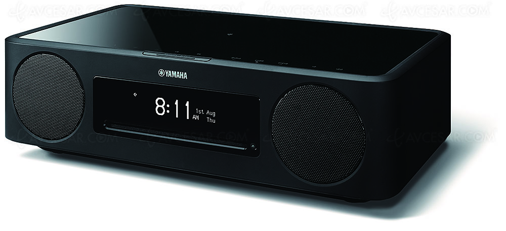 Para estar completo en el Yamaha TSX-N237D, también debemos mencionar la presencia, además del sintonizador FM, de un sintonizador DAB+ y la función de carga inalámbrica Qi. Para hacer esto, simplemente coloque su teléfono inteligente, auriculares True Wireless o reloj inteligente compatible encima de Yamaha MusicCast. Práctico (ver foto a continuación). Finalmente, también están presentes un ecualizador, un modo para amplificar las bajas frecuencias y un reloj con función de alarma.