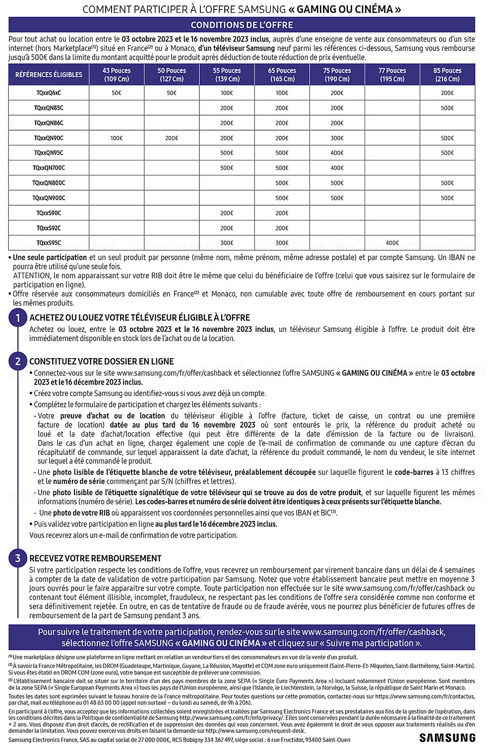 Hasta el 16 de noviembre de 2023, por cualquier compra de un televisor al que se hace referencia a continuación (haz clic en su referencia para saber más sobre el producto), la marca te reembolsará: • 50 € por un televisor Samsung TQ43Q6xC o Samsung TQ50Q6xC • 100 € para un televisor Samsung TQ43QN90C, Samsung TQ55Q6xC o Samsung TQ65Q6xC • 200 € para un televisor Samsung TQ55S90C, Samsung TQ55S92C, Samsung TQ65S90C, Samsung TQ65S92C, Samsung TQ50QN90C, Samsung TQ55QN90C, Samsung TQ65QN90 Samsung TQ75Q6xC, Samsung TQ85Q6xC, Samsung TQ55QN85C, Samsung TQ65QN85C, Samsung TQ75QN85C, Samsung TQ55QN86C, Samsung TQ65QN85C o Samsung TQ75QN86C • 300 € para un televisor Samsung TQ75QN90C, Samsung TQ55S95C o Samsung TQ65S95C • 400 € para un Samsung TQ75QN9 5C, Samsung TQ75QN700C o Samsung TV TQ77S95C • 500 € por un televisor Samsung TQ55QN95C, Samsung TQ65QN95C, Samsung TQ55QN700C, Samsung TQ65QN700C, Samsung TQ65QN800C, Samsung TQ75QN800C, Samsung TQ65QN900C, Samsung TQ75QN900C, Samsung TQ85QN85 C, Samsung TQ85QN 90C, Samsung TQ85QN95C, Samsung TQ85QN800C o Samsung TQ85QN900C