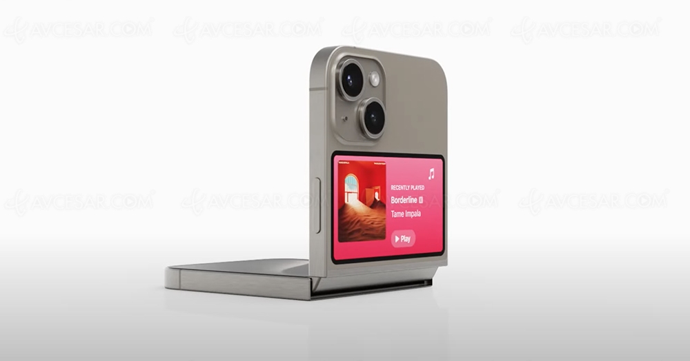 En este video puedes admirar un iPhone con pantalla plegable y diseño plegable como el Galaxy Z Flip de Samsung. Llamado iPhone iPhone 16 Flip, utiliza los bordes rectos inaugurados por la gama iPhone 12 y tiene un doble fotosensor en la parte trasera, debajo del cual hay una pequeña pantalla adicional que permite consultar la hora y las notificaciones cuando el dispositivo está plegado. También tenga en cuenta los bordes de titanio cepillado como los del iPhone 15 Pro, asà como el nuevo puerto USB.