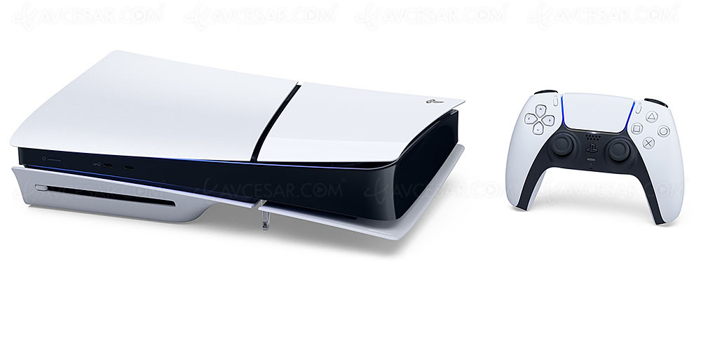 Como era de esperar, la nueva PS5 es menos voluminosa que el modelo original (Largo x Alto x Fondo: 358 × 96 × 216 mm), -30% en volumen, -18% a -24% en peso según el modelo. Edición estándar o edición digital (3,2 kg y 2,6 kg respectivamente).