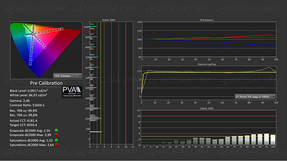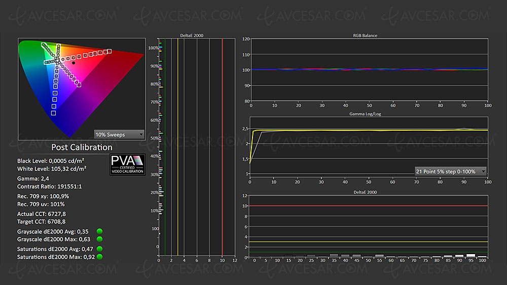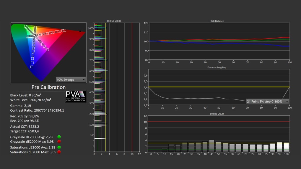Sin embargo, repetimos, el modo Cineasta no es garantía de una calidad de imagen SDR óptima. Para esto, nada mejor que una calibración adecuada, como demuestran nuestras mediciones una vez que se ha calibrado la pantalla (vea la captura de pantalla a continuación). Puede verlo fácilmente (haga clic en las capturas para hacer zoom), las lecturas son casi perfectas después de una calibración manual en comparación con el modo Filmmaker (vea la primera foto de arriba, como recordatorio).
